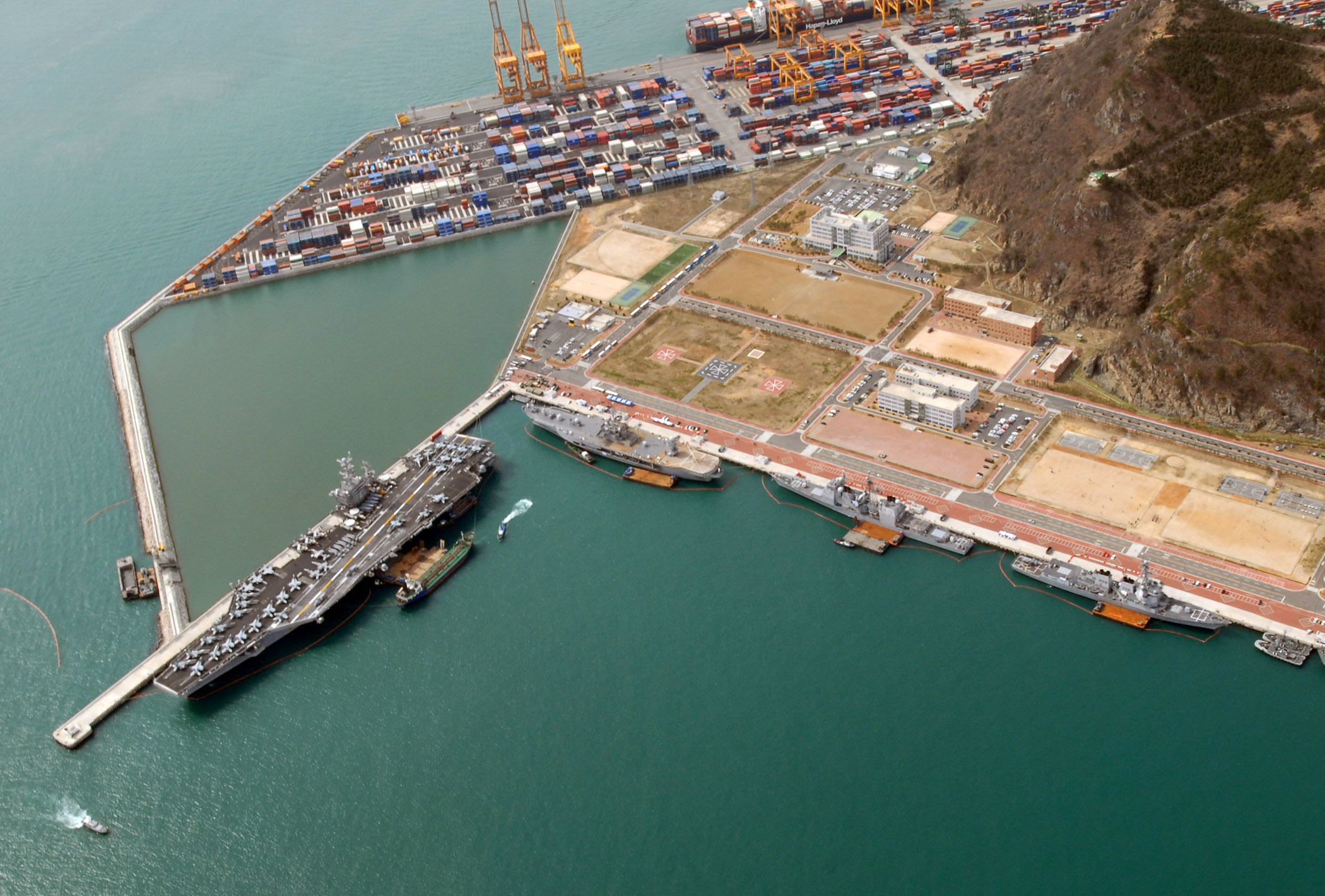 090312-N-1113S-197 BUSAN, Republic of Korea (March 12, 2009) Ships from the John C. Stennis Carrier Strike Group and U.S. 7th Fleet flagship USS Blue Ridge (LCC 19) are moored pier side at the Republic of Korea Navy Base Oryuk-Do in Busan. The strike group arrived March 11, while Blue Ridge pulled in March 5. Pictured from left are the aircraft carrier USS John C. Stennis (CVN 74), the amphibious command ship USS Blue Ridge, the guided-missile cruiser USS Antietam (CG 54) and the guided-missile destroyer USS Preble (DDG 88). (U.S. Navy photo by Mass Communication Specialist 2nd Class Matthew Schwarz/Released)